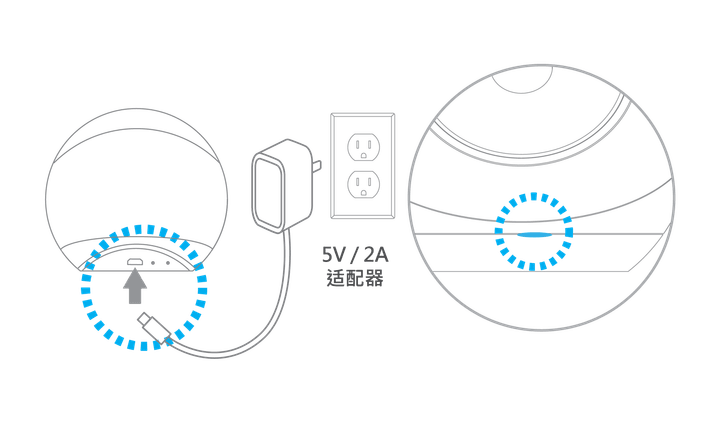 将5V/2A变压器连接到插座,在将MicroUSB连接上机台,通电时,正面蓝色LED灯将亮起,经过约25秒,确认蓝色LED灯闪烁时,可进行下一步安装动作。